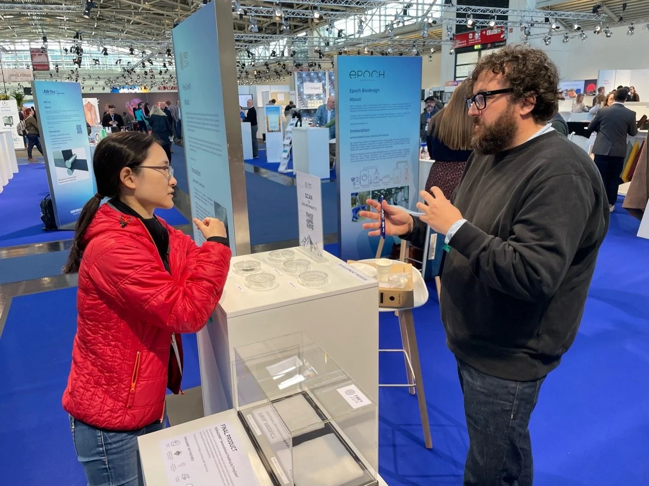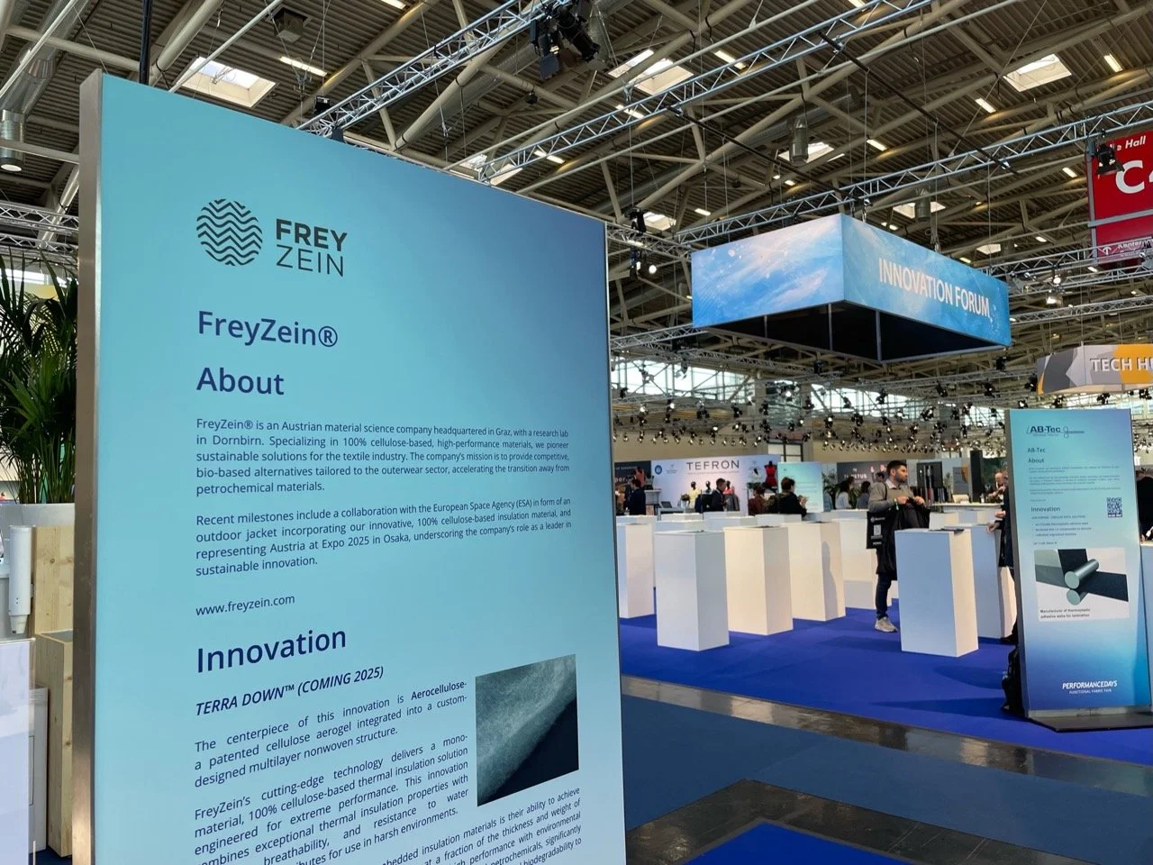 Presented live on site by FreyZein’s R&D team, Dr. Solmaz Ghanbarnezhad, Dr. Barnaby Caven and Madeleine Müller, samples of our innovative, aerocellulose-infused nonwoven thermal insulation TerraDown™ were shown to visitors, alongside a material story explaining the production process. Additionally, FreyZein debuted its innovative monomaterial, multilayer-fabric TerraTech™, including the world’s first water-proof cellulose-based membrane.